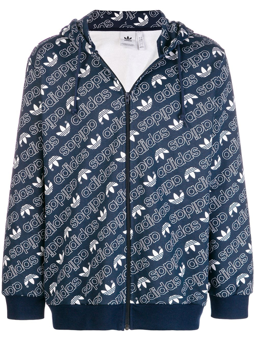 zip front hoodie Sports are deeply rooted within the brand ideology at Adidas and continue to play a major role in the design and construction of the label’s contemporary products. This navy and white zip front hoodie is crafted from a cotton blend and features a hood with drawstring tie fastenings, long sleeves, a front zip fastening, a relaxed shape and an all over logo print. Imported Composition Cotton 95%, Spandex/Elastane 5% SIZE & FIT Model measurements Height 6 ft 2 in(1.87 m) Bust/Chest 37.4 in(95 cm) Hips 37.4 in(95 cm) Waist 29.92 in(76 cm)