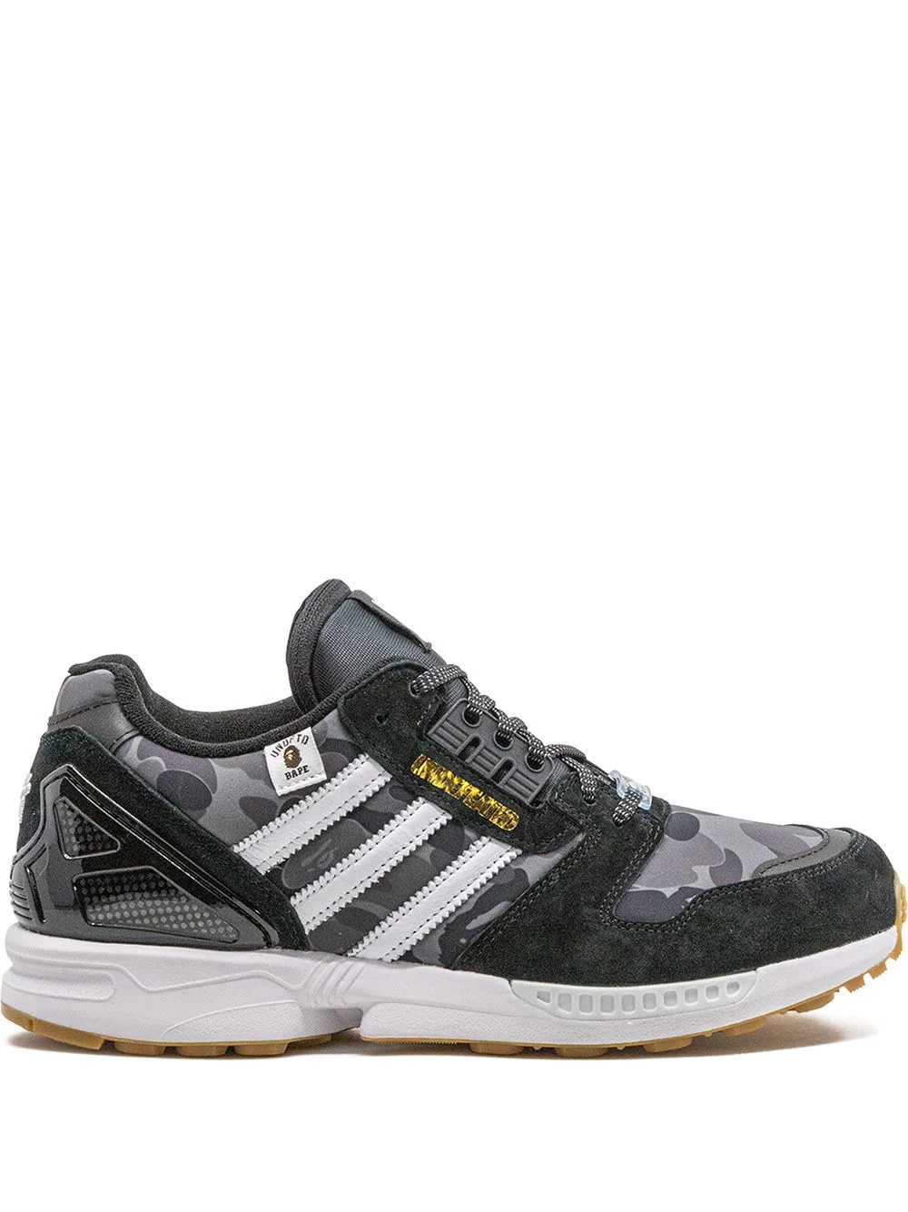 x Bape x Undefeated ZX 8000 "Black" sneakers The BAPE x Undefeated x adidas ZX 8000 “Black” is part of a three-way Winter 2020 collaboration. Black suede overlays appear on the forefoot, eyelets, and heel counter, whilst BAPE’s iconic First Camo print in grey and black can be found on the toe, mid-panel, and collar. “A Bathing Ape” branding is located on the overlay beneath the eyelets and white leather Three Stripes detailing can be found on either side. Additional branding appears in the form of a dual branded Undefeated and BAPE hang tag on the collar. Imported Composition Outer: Leather 100%, Polyamide 100% Lining: Nylon 100% Sole: Rubber 100%