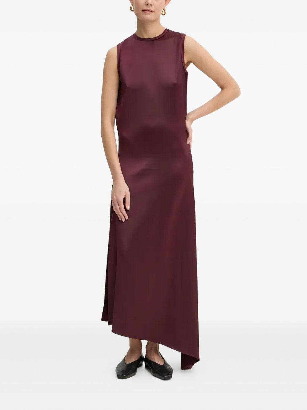 asymmetric sleeveless dress Highlights - Burgundy - Sleeveless - Round neck - Asymmetric hem - Keyhole back - Satin finish Imported Composition Recycled Polyester 53%, Polyester 44%, Elastane 3% Washing instructions Read Manufacturer Guidelines