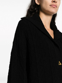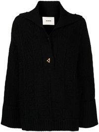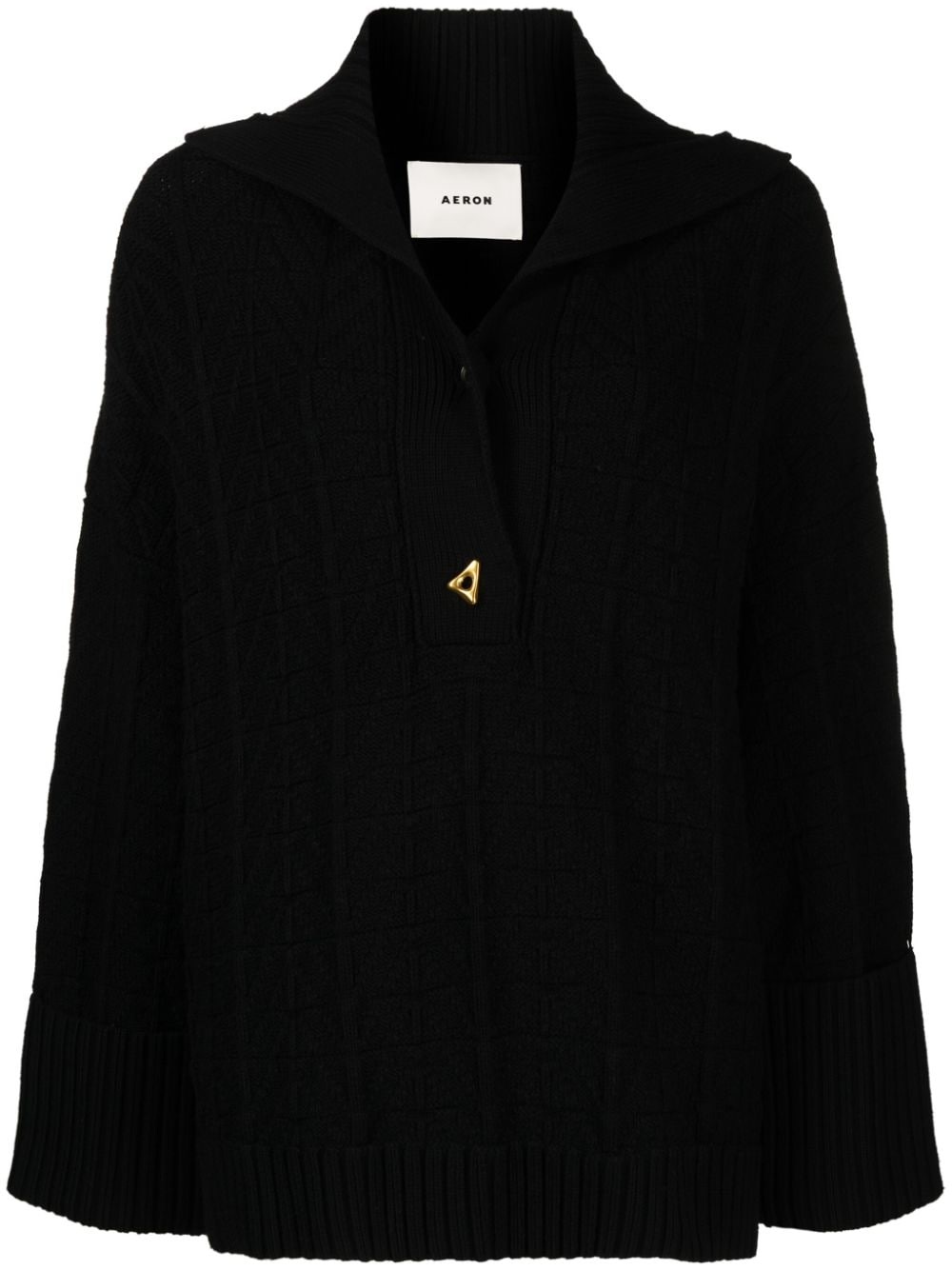 Baker chevron-jacquard jumper AERON takes a purposeful approach to its knitwear designs, which is why this Baker jumper is spun with FSC-certified viscose threads for a lower impact. It’s woven with a raised chevron jacquard pattern then detailed with turn-up cuffs and a gold-tone ‘A’ button at the front placket. Highlights - Black - Fsc viscose blend - Patterned jacquard - Spread collar - Front button placket - Drop shoulder - Long sleeves - Turn-up cuffs - Short side slits - Ribbed trim Imported Composition FSC Viscose 72%, Polyester 28% SIZE & FIT Model measurements Height 5 ft 10 in(1.79 m) Bust/Chest 33.07 in(84 cm) Hips 35.82 in(91 cm) Waist 24.01 in(61 cm) FittingInformation Designed to be unstructured, offering a loose fit throughout Made with a midweight knit, this piece offers some stretch This piece fits true to size – take your usual size Washing instructions Dry Clean Only