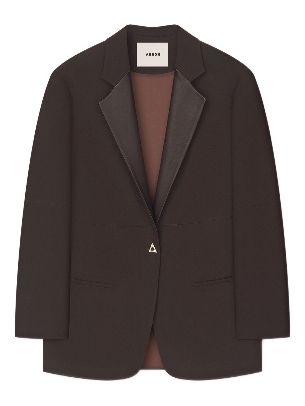 leather-trimmed blazer Highlights - Dark chocolate - Leather trim - Single button fastening - Padded shoulders - Wide peak lapel - Straight hem Imported Composition Lining: Viscose 100% Outer: Leather 100%, Polyester 68%, Viscose 29%, Elastane 3%