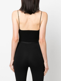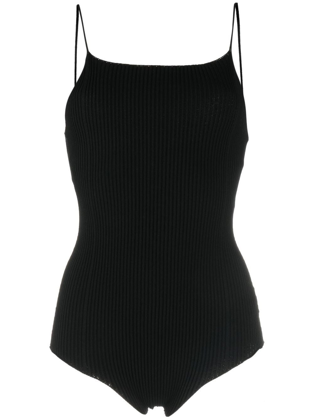 Lourde sleeveless ribbed bodysuit black FSC viscose ribbed knit scoop neck spaghetti straps sleeveless square open back Just a reminder that this piece must be tried on over your own garments. Made in Italy Composition FSC Viscose 70%, Polyester 30% SIZE & FIT Model measurements Height 5 ft 10 in(1.78 m) Bust/Chest 31.49 in(80 cm) Hips 36.22 in(92 cm) Waist 25.59 in(65 cm) FittingInformation This piece fits true to size. We recommend you get your regular size Cut for a close fit Made with a mid-weight fabric