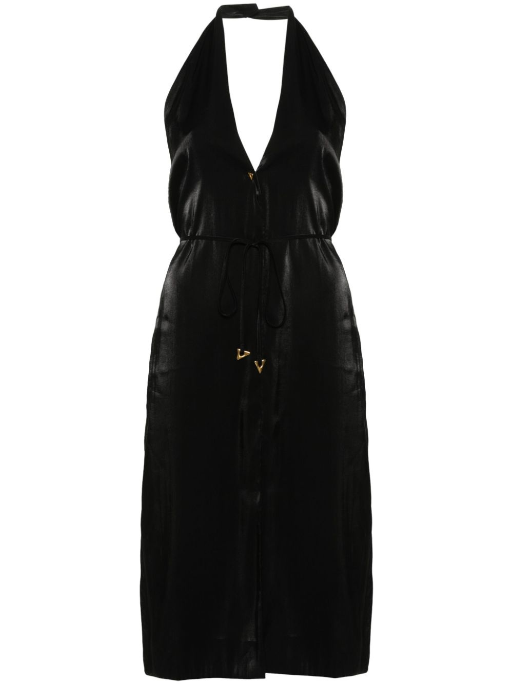 Seraphine belted midi dress Highlights - Black - Fsc viscose - Metallic finish - Halterneck - V-neck - Sleeveless - Detachable waist belt - Front slit - Straight hem Imported Composition FSC Viscose 68%, Polyester 32% SIZE & FIT FittingInformation Designed to be unstructured, offering a loose fit throughout The adjustable tie waist gives a more adaptable and personalised fit Made from a midweight non-stretch fabric This piece fits true to size – take your usual size