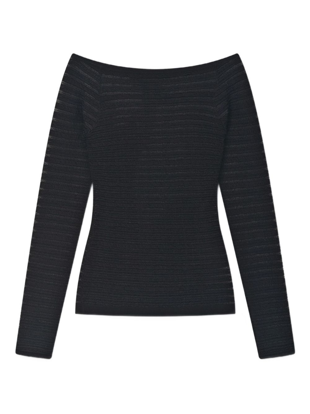 shiny textured-knit top Highlights - Black - Ribbed knit - Boat neck - Long sleeves Imported Composition Viscose 80%, Nylon 15%, Polyester 4%, Elastane 1% Washing instructions Read Manufacturer Guidelines
