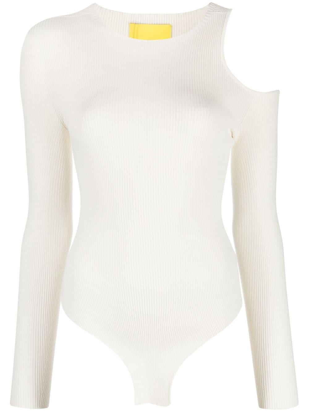 Zero knitted bodysuit Inspired by contemporary art and textiles influences throughout AERON's collections. This SS23 bodysuit highlights this in a minimalist way, with a knitted construction and cut-out at the shoulder. Highlights - Cream white - Fine ribbed - Round neck - Long sleeves - Cut-out detailing - Just a reminder that this piece must be tried on over your own garments. Made in Italy Composition Outer: Viscose 72%, Polyester 28% Washing instructions Dry Clean Only