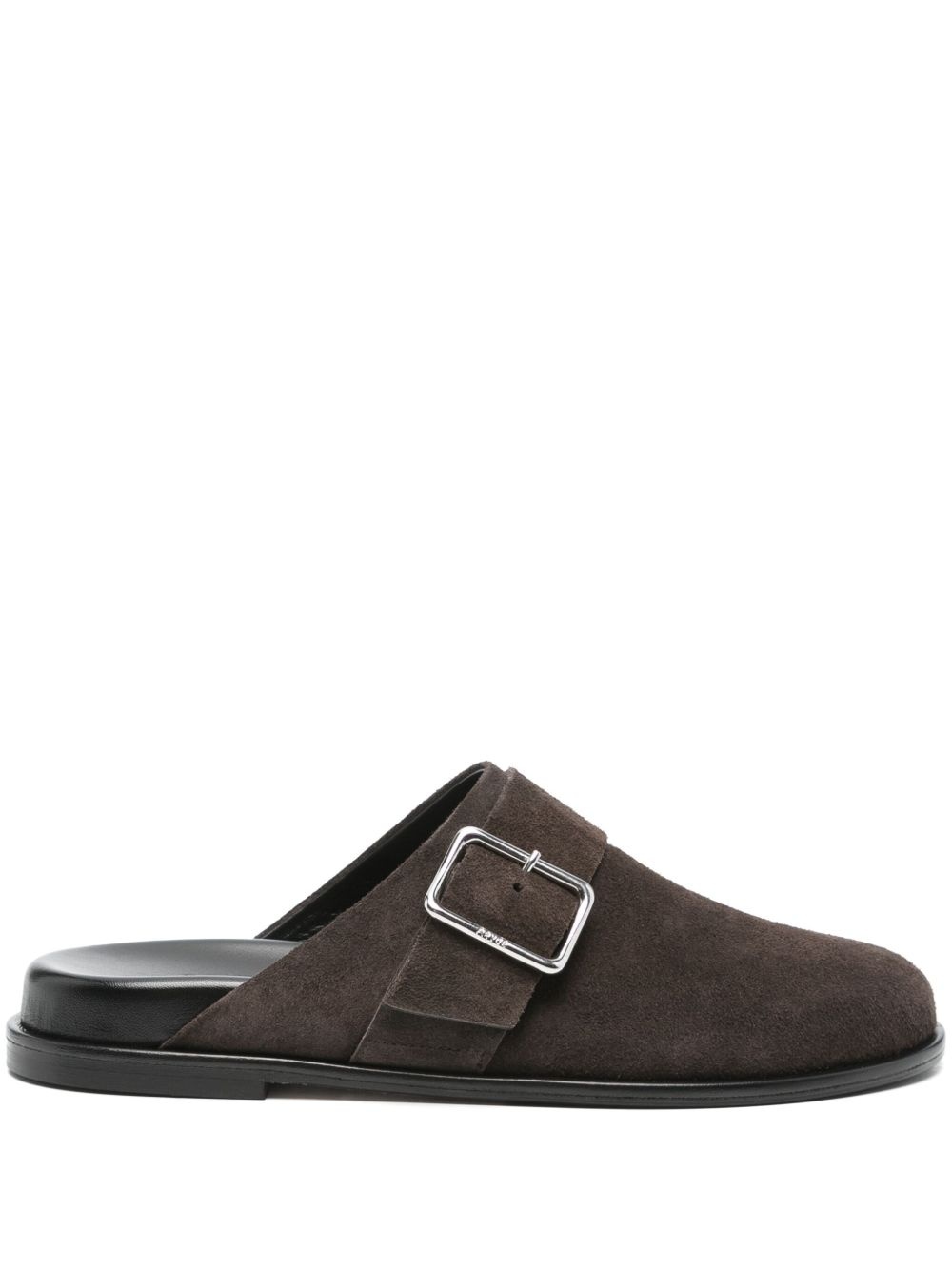 Finja slippers Highlights - Cedar brown - Decorative buckle detail - Branded leather insole - Rubber sole - Round toe Made in Italy Composition Lining: Calf Leather 100% Sole: Rubber 100%, Calf Suede 100% Outer: Calf Suede 100%