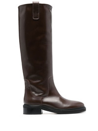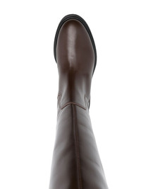 knee-length leather boots brown calf leather knee-length pull-on style tonal stitching almond toe flat rubber sole Made in Italy Composition Outer: Calf Leather 100% Lining: Calf Leather 100% Sole: Calf Leather 100%, Rubber 100% SIZE & FIT Measurement CIRCUMFERENCE 14.96 in(38 cm) HEEL 1.57 in(4 cm) HEIGHT 16.14 in(41 cm) Sole height 0.98 in(2.5 cm)