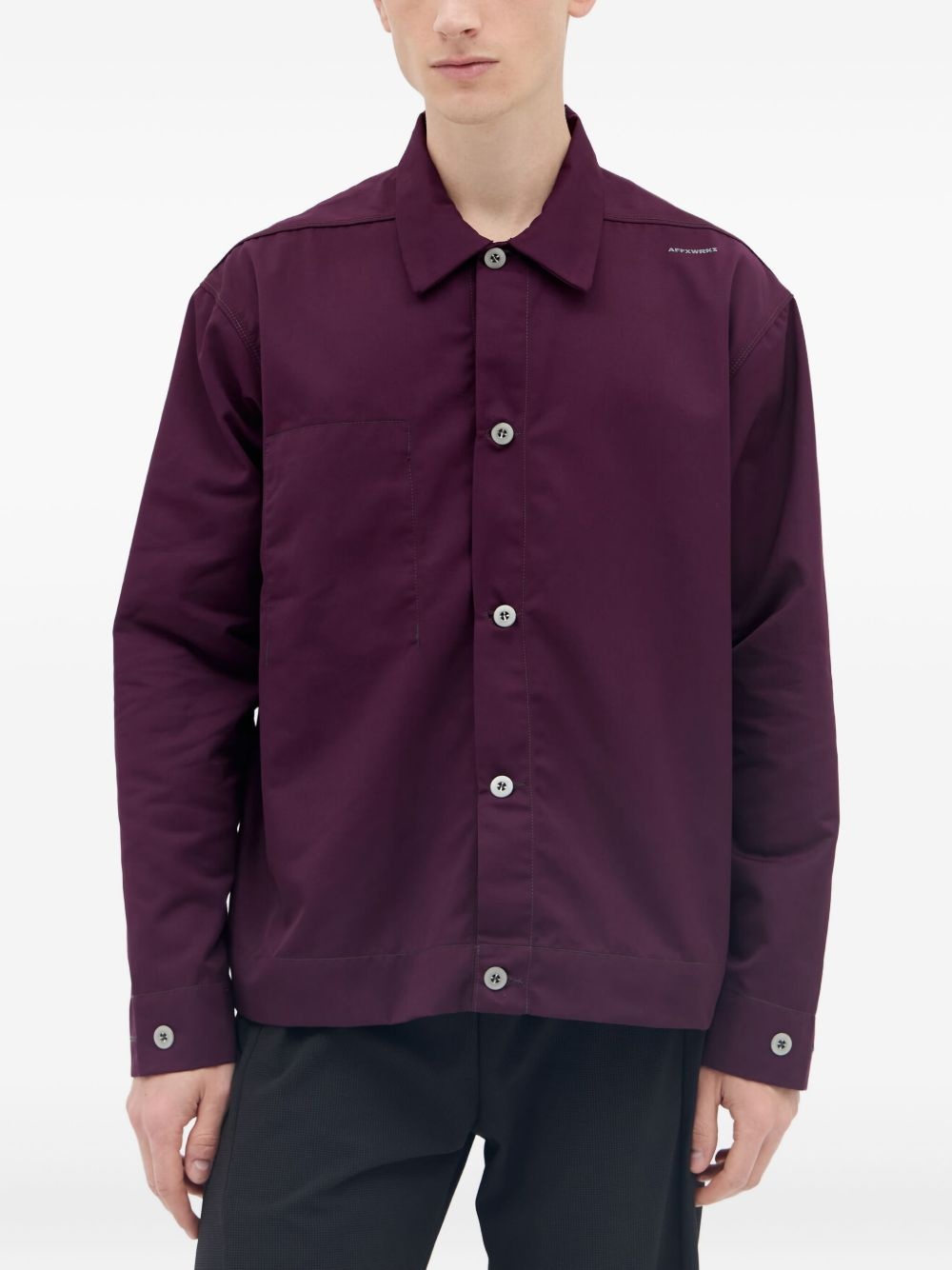 logo-print shirt jacket Highlights - Aubergine - Front button fastening - Buttoned cuffs - Long sleeves - Waist tabs Imported Composition Polyester 65%, Cotton 35%