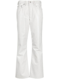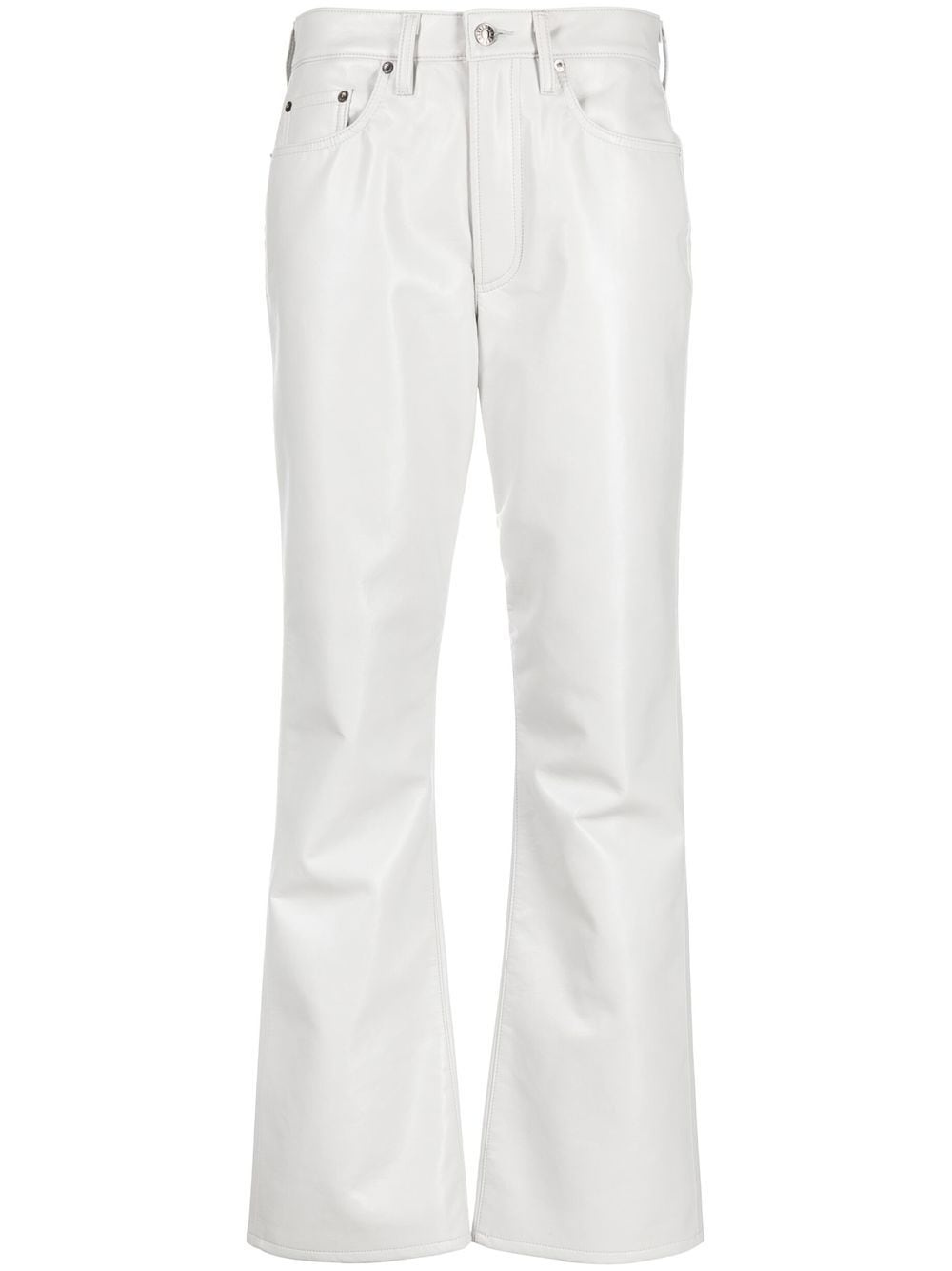 bootcut leather-blend trousers Highlights - Light grey - Recycled leather blend - Classic five pockets - Belt loops - Front button and zip fastening - Flared Made in United States Composition Recycled Leather 50%, Polyurethane 30%, Viscose 10%, Polyester 10% SIZE & FIT Model measurements Height 5 ft 11 in(1.8 m) Bust/Chest 31.49 in(80 cm) Hips 36.61 in(93 cm) Waist 24.4 in(62 cm) FittingInformation Designed with a flared hem, these trousers allow for a close fit at the waist with a slim fit over the leg and widening towards the hem Washing instructions Specialist Cleaning