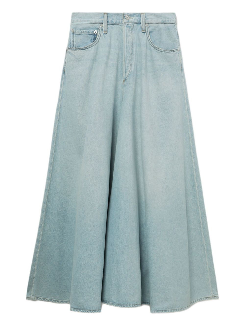denim flared maxi skirt Highlights - Light blue - A-line shape - High waist - Five-pocket styling - Button fly - Cotton Made in United States Composition Cotton 100% Washing instructions Read Manufacturer Guidelines