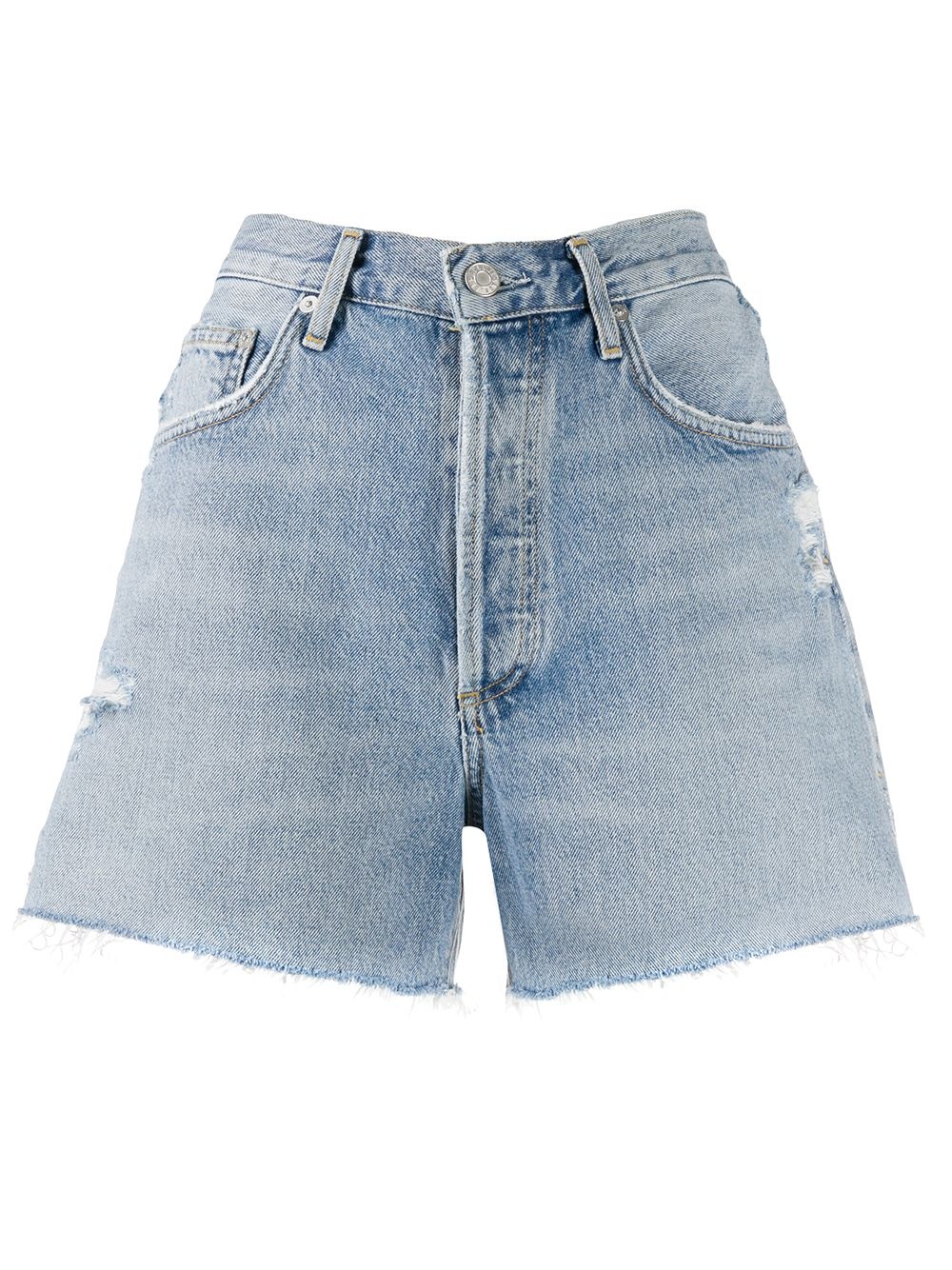distressed denim shorts Highlights - Blue - Distressed effect - Front button and zip fastening - Classic five pockets Imported Composition Organic Cotton 100% SIZE & FIT FittingInformation This piece fits true to size. We recommend you get your regular size Designed to be fitted at the waist and hips, loose over the leg Made with a mid-weight non-stretch fabric Washing instructions Machine Wash