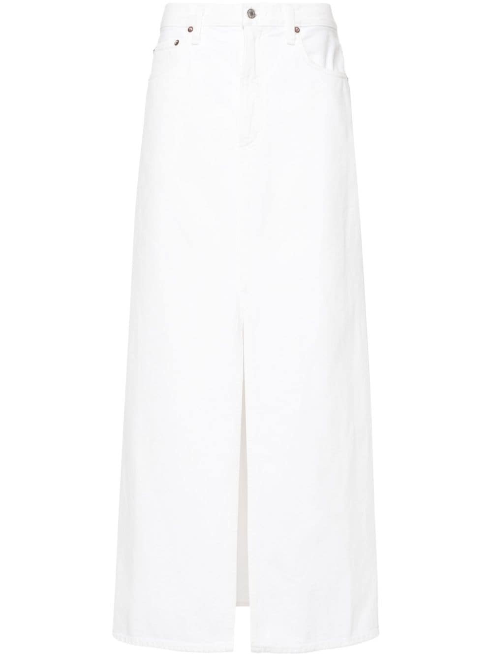 Leif denim skirt Highlights - Milk white - Cotton - Denim - Belt loops - Classic five pockets - Front slit - Unlined - Front button and zip fastening Made in United States Composition Regenerative Cotton 100% SIZE & FIT Measurement HIPS 40.94 in(104 cm) LENGTH 38.58 in(98 cm) WAIST 33.07 in(84 cm) Washing instructions Machine Wash