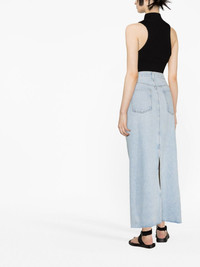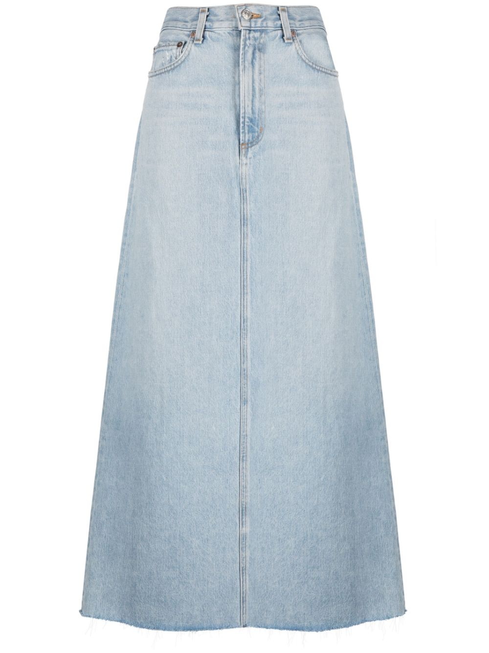 maxi denim skirt Highlights - Light blue - Organic cotton - Mid-rise - Belt loops - Frayed edge - Central rear vent - Front button and zip fastening - Classic five pockets - Ankle-length Made in United Kingdom Composition Organic Cotton 100% SIZE & FIT Model measurements Height 5 ft 10 in(1.77 m) Bust/Chest 31.49 in(80 cm) Hips 35.03 in(89 cm) Waist 23.22 in(59 cm) FittingInformation This midi-length skirt is intended to be worn just below the waist Sturdy and hard-wearing, this denim piece offers no stretch This piece fits true to size – take your usual size Washing instructions Machine Wash