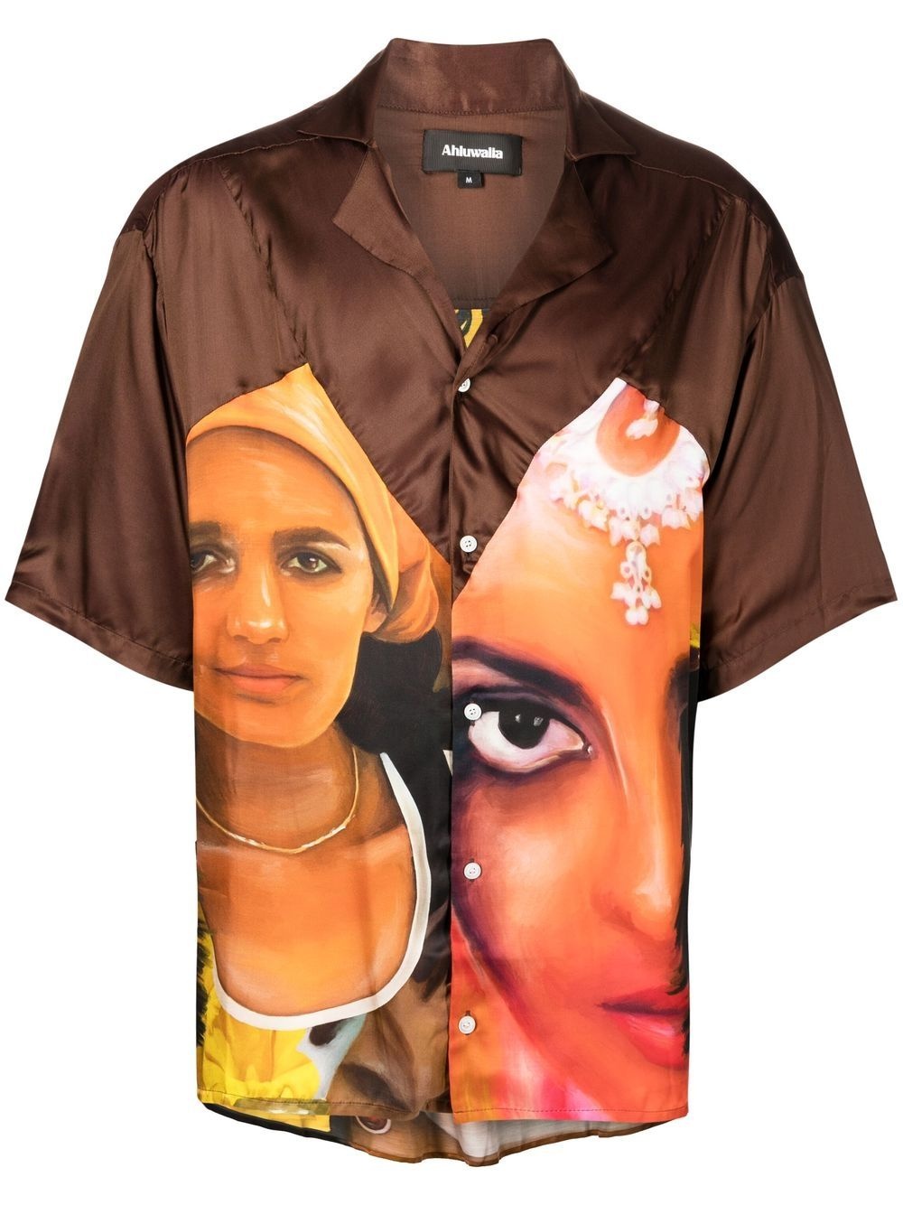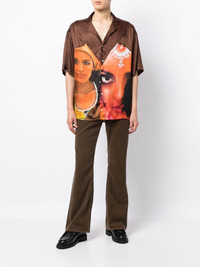 graphic-print short-sleeved shirt dark brown silk blend satin finish graphic print to the front spread collar front button fastening short sleeves straight hem Imported Composition Viscose 79%, Silk 21% SIZE & FIT Model measurements Height 6 ft 2 in(1.87 m) Bust/Chest 34.25 in(87 cm) Hips 36.22 in(92 cm) Waist 29.52 in(75 cm) FittingInformation This piece fits true to size. We recommend you get your regular size Cut for an oversized fit Made with a lightweight non-stretch fabric Washing instructions Dry Clean Only