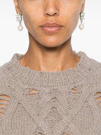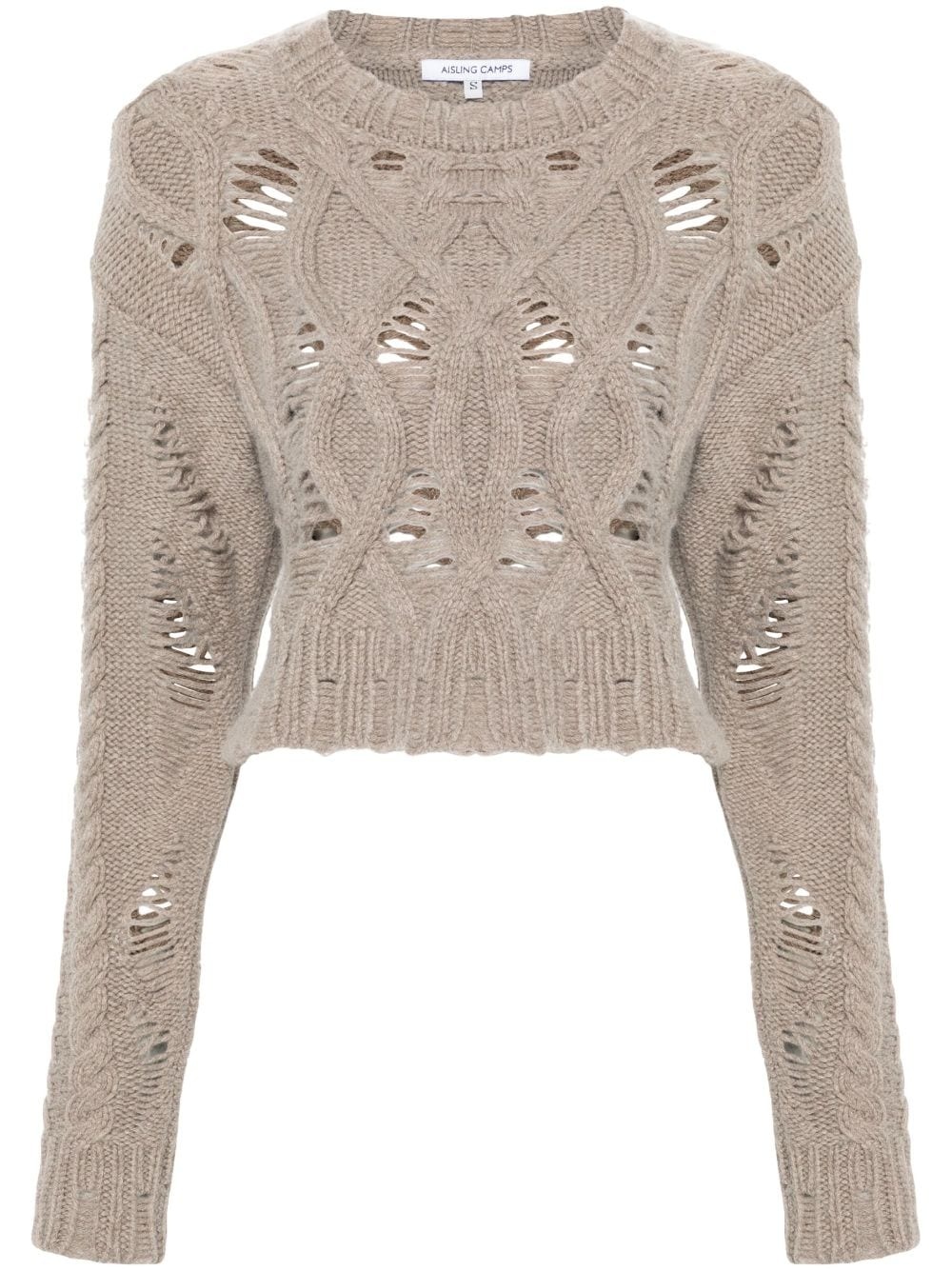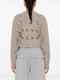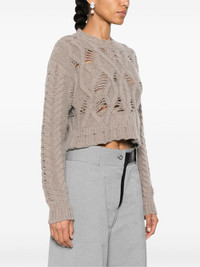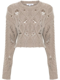 cable-knit cropped sweater Highlights - Taupe grey - Merino wool blend - Knitted construction - Cable knit - Distressed finish - Crew neck - Drop shoulder - Long sleeves - Ribbed cuffs and hem - Straight hem Made in Italy Composition Merino 70%, Cashmere 30% SIZE & FIT Model measurements Height 5 ft 10 in(1.78 m) Bust/Chest 33.07 in(84 cm) Hips 36.61 in(93 cm) Waist 24.8 in(63 cm) FittingInformation Designed for a relaxed fit, this piece allows for comfort and movement when worn Cropped in length Made with a midweight knit, this piece offers some stretch This piece fits true to size – take your usual size