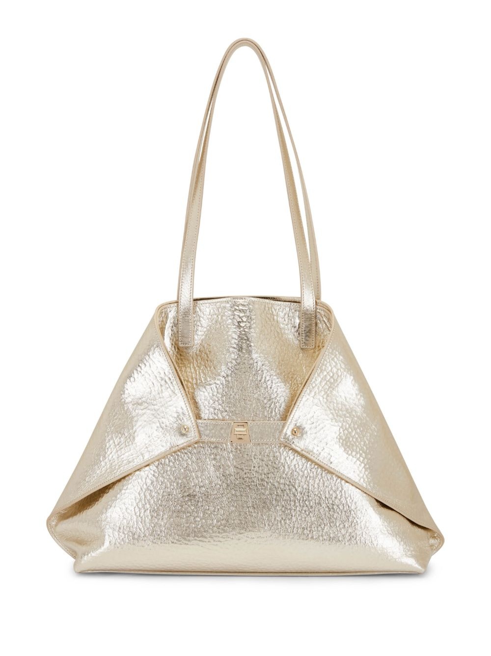 Ai metallic shoulder bag Highlights - Gold-tone - Leather - Grained texture - Metallic finish - Folded design - Twist-lock fastening - Two flat top handles - Internal zip-fastening pocket - Multiple internal slip pockets - Detachable coin purse Made in United States Composition Outer: Grained Leather 100% SIZE & FIT Measurement DEPTH 4 in(10.1 cm) HEIGHT 12 in(30.4 cm) STRAP 11 in(27.9 cm) WIDTH 15 in(38.1 cm)
