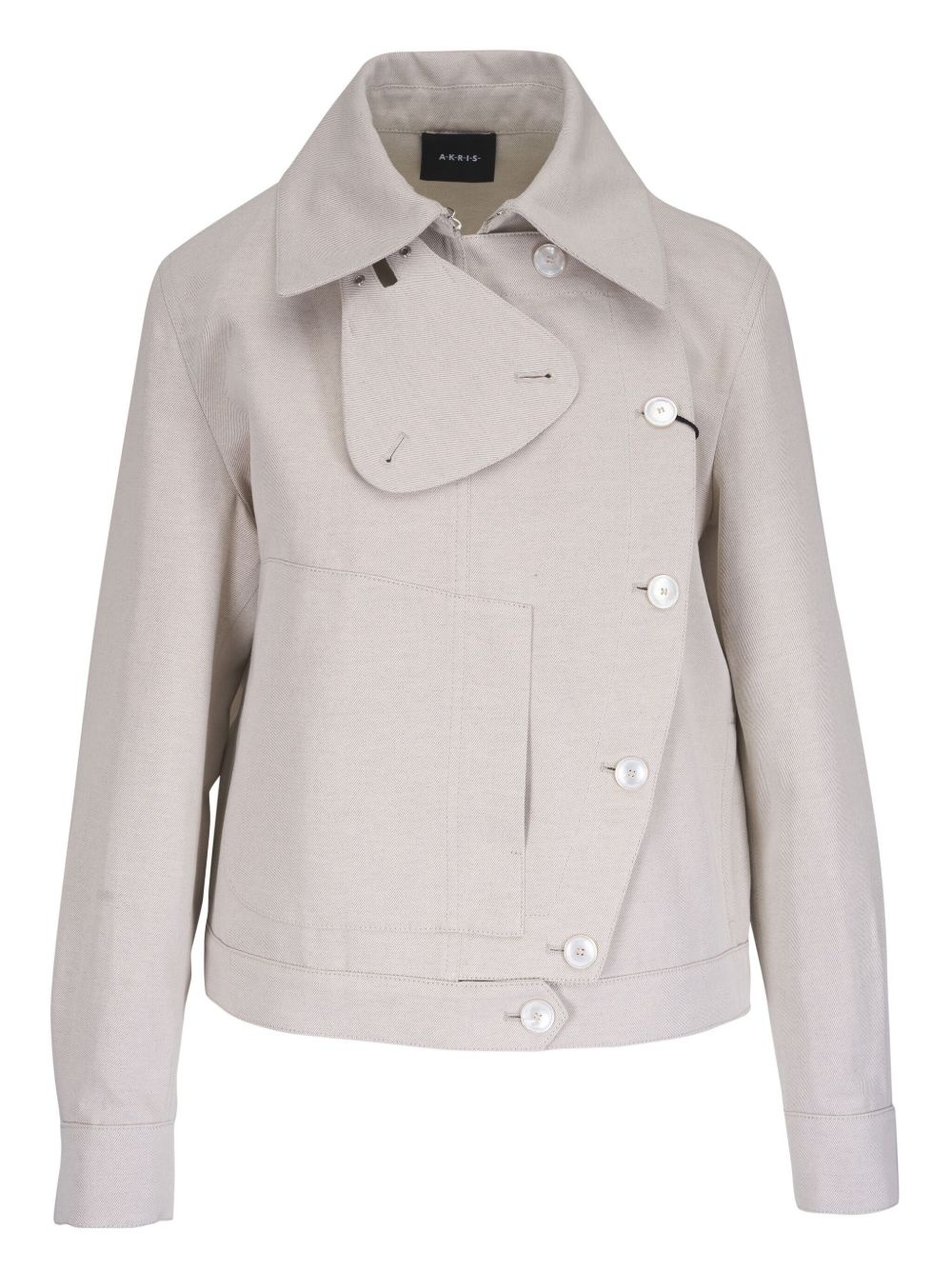 asymmetric jacket Highlights - Light grey - Off-centre front button fastening - Two side inset pockets - Buttoned cuffs - Oversized pointed collar Made in Italy Composition Cotton 51%, Linen/Flax 49%