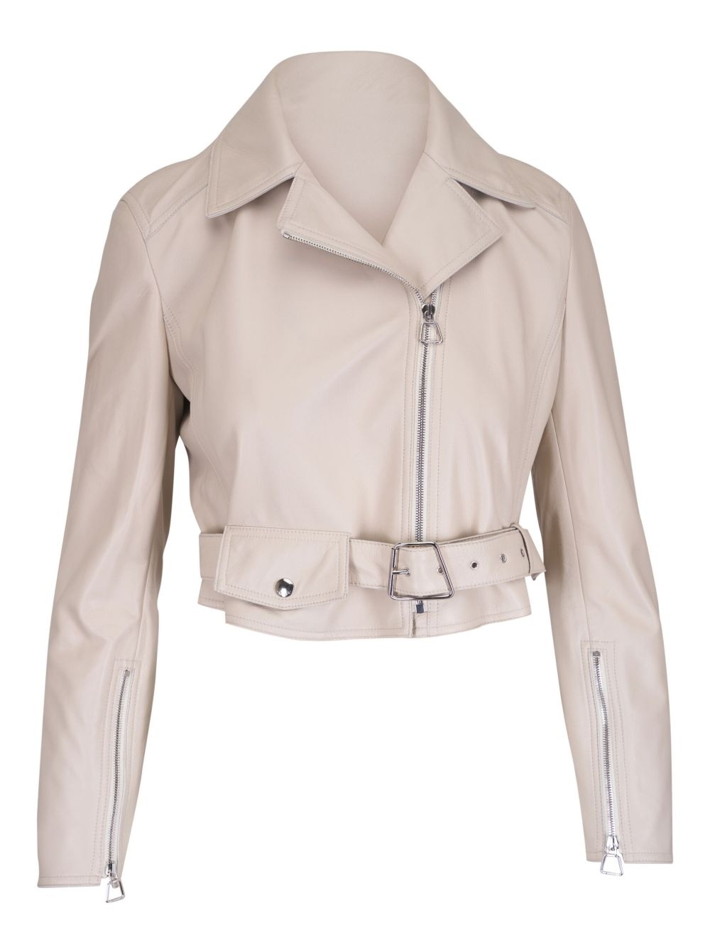 cropped leather jacket Highlights - Cream beige - Notched lapels - Front zip fastening - Belted waist - Zip pocket details - Long sleeves Made in United States Composition Outer: Lamb Skin 100% Lining: Mulberry Silk 100%