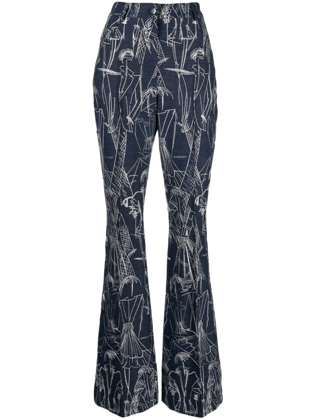 sketch-print flared jeans Highlights - Blue - Stretch-cotton - Denim - Sketch-style print - Pressed crease - Belt loops - Button fly fastening - High-waisted - Flared - Two rounded pockets to the sides - Straight hem Imported Composition Body: Cotton 98%, Polyurethane 2% Lining: Acetate 96%, Elastane 4% SIZE & FIT Model measurements Height 5 ft 10 in(1.77 m) Bust/Chest 28.74 in(73 cm) Hips 35.82 in(91 cm) Waist 24.4 in(62 cm) FittingInformation Designed with a flared hem, these jeans allow for a close fit at the waist with a slim fit over the leg and widening towards the hem Sturdy and hard-wearing, this denim piece offers no stretch This piece fits small – take one size up