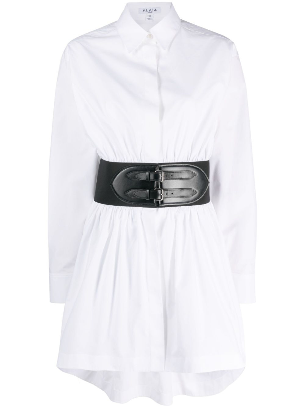 belted cotton shirt Alaia is lauded for its unique take on classic silhouettes. A case in point, this white cotton poplin shirt is cinched with a double-buckle leather belt that enhances the voluminous curved hem. Highlights - White - Cotton - Poplin texture - Calf leather - Gathered detailing - Classic collar - Belted waist - Concealed front button fastening - Long sleeves - Curved hem Made in Italy Composition Lining: Polyamide 72%, Spandex/Elastane 28% Outer: Cotton 100%, Calf Leather 100% SIZE & FIT Model measurements Height 5 ft 10 in(1.78 m) Bust/Chest 30.7 in(78 cm) Hips 34.64 in(88 cm) Waist 23.22 in(59 cm) Measurement SLEEVE LENGTH 23.62 in(60 cm) LENGTH 37 in(94 cm) WAIST 29.92 in(76 cm) BUST 39.37 in(100 cm) Shoulder Width 19.68 in(50 cm) FittingInformation Designed to be unstructured, offering a loose fit throughout The elasticated waist allows for a comfortable fit Made from a midweight non-stretch fabric This piece fits true to size – take your usual size