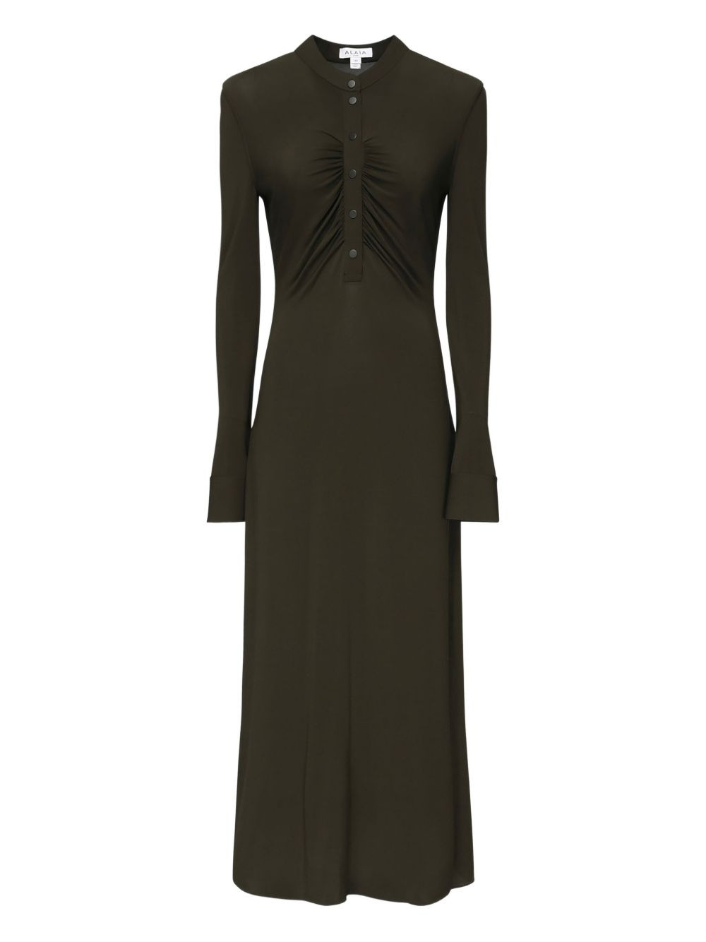 button-front gathered maxi dress