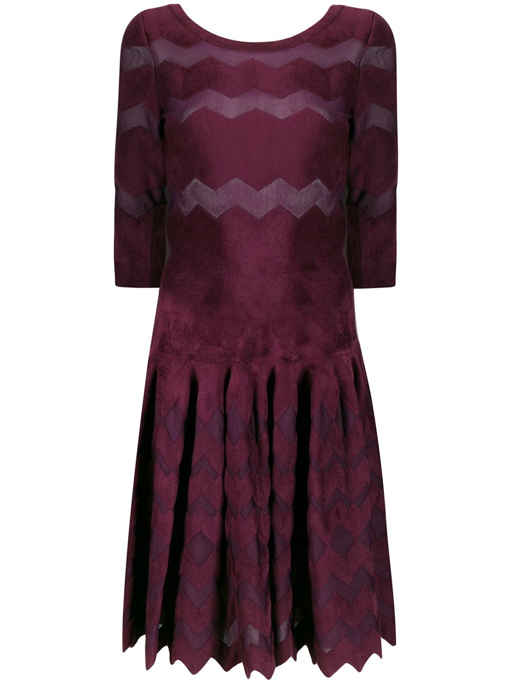 chevron-patterned midi dress Purple silk-blend chevron-patterned midi dress from Alaia featuring a flared style, a concealed rear zip fastening, three-quarter length sleeves, a cinched waist, a scalloped hem and a mid-length. Made in Italy Composition Outer: Silk 40%, Viscose 35%, Polyamide 23%, Spandex/Elastane 2% Lining: Silk 100% SIZE & FIT Model measurements Height 5 ft 11 in(1.8 m) Bust/Chest 33.07 in(84 cm) Hips 37.4 in(95 cm) Waist 25.19 in(64 cm) FittingInformation This piece fits true to size. We recommend you get your regular size Designed for a close fit at the bust, waist and hips Made with a mid-weight fabric Washing instructions Dry Clean Only