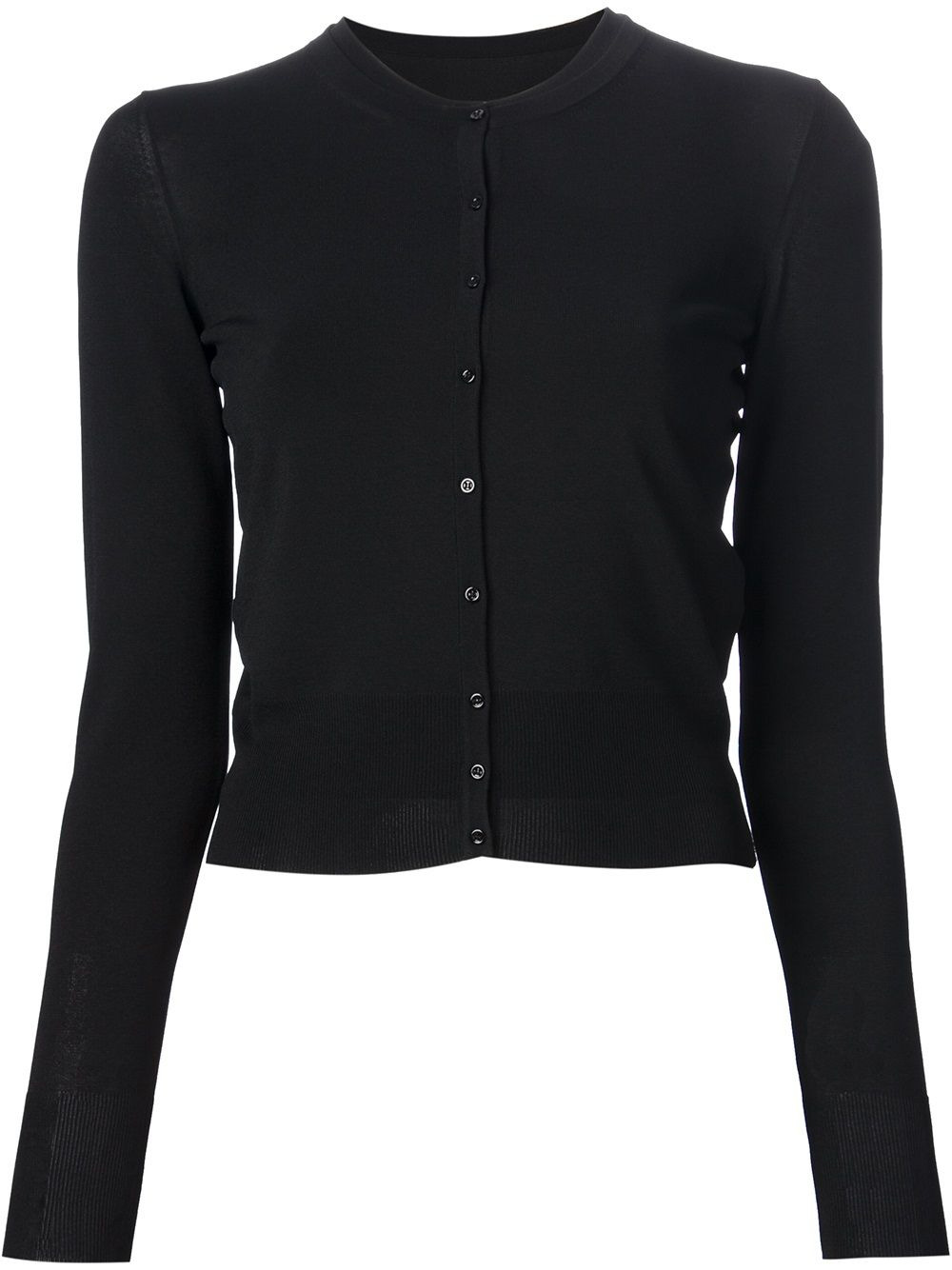 fitted cardigan Black fitted cardigan from Alaia featuring a round neck, long sleeves, a button fastening, ribbed cuffs and a ribbed hem. Made in Italy Composition Viscose 94%, Polyester 6% Washing instructions Dry Clean Only