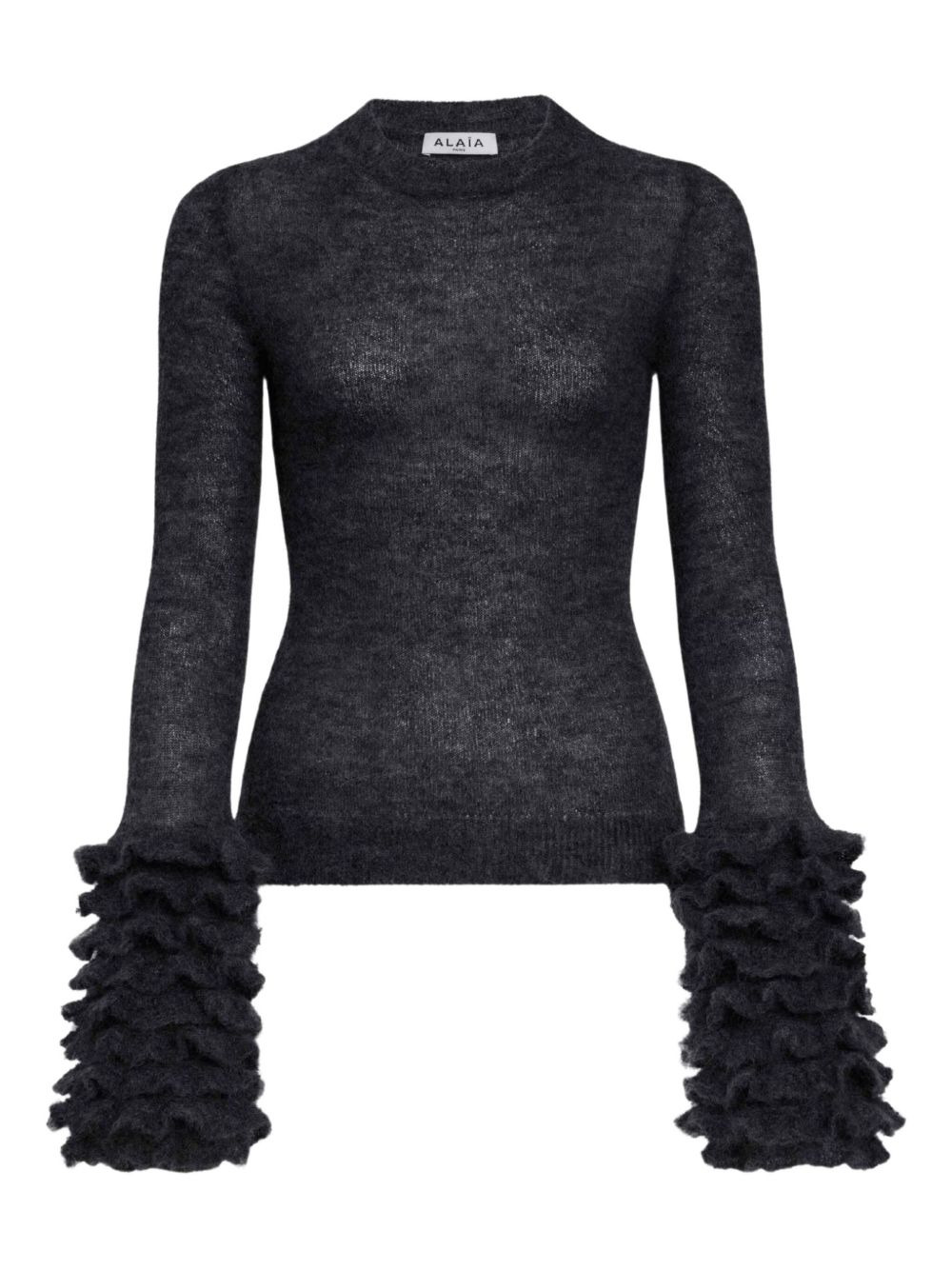 frill-cuff sweater Highlights - Dark grey - Ruffled cuffs - Long sleeves - Round neck - Mohair blend Made in Italy Composition Mohair 56%, Polyamide 34%, Wool 10% Washing instructions Read Manufacturer Guidelines