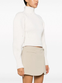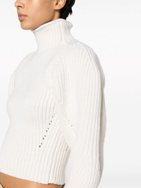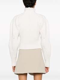 high-neck ribbed-knit jumper Spun from a wool blend, this jumper by Alaia exhibits a ribbed-knit construction accented with a high neck and gentle curves that sculpt the loose silhouette. On the back, an invisible zip adds practicality to the look. Highlights - White - Wool-cashmere blend - Knitted construction - Ribbed knit - High neck - Drop shoulder - Long sleeves - Ribbed cuffs and hem - Concealed rear zip fastening - Straight hem Made in Italy Composition Wool 90%, Cashmere 8%, Polyamide 2% SIZE & FIT Model measurements Height 5 ft 9 in(1.76 m) Bust/Chest 31.88 in(81 cm) Hips 35.43 in(90 cm) Waist 24.8 in(63 cm) FittingInformation Designed for a slim fit that sits just away from the body offering a close yet comfortable fit Made with a midweight knit, this piece offers some stretch This piece fits true to size – take your usual size Washing instructions Dry Clean Only