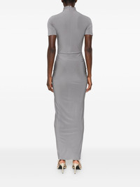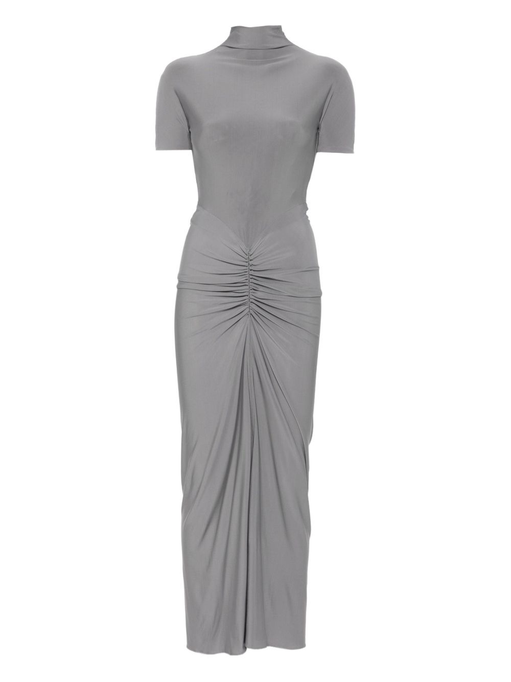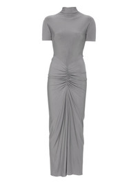 jersey maxi dress Highlights - Grey - Short sleeves - Gathered detailing at the waist - High neckline - Concealed back zip closure Made in Italy Composition Viscose 96%, Spandex/Elastane 4% SIZE & FIT Model measurements Height 5 ft 10 in(1.77 m) Bust/Chest 32.28 in(82 cm) Hips 35.03 in(89 cm) Waist 25.19 in(64 cm) Washing instructions Dry Clean Only