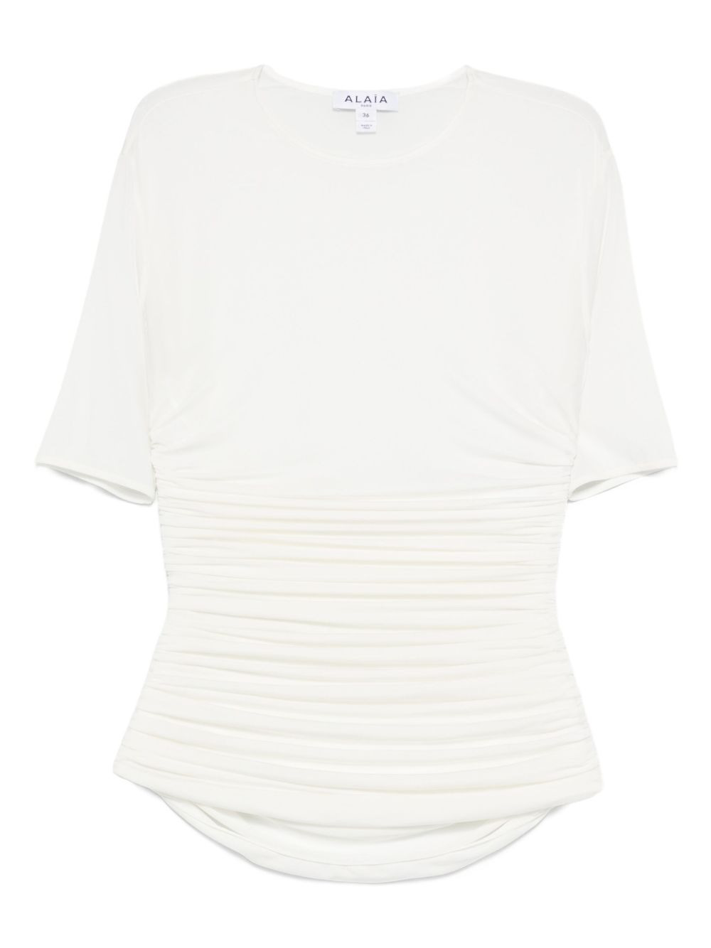 round-neck T-shirt Highlights - White - Ruched detailing - Short sleeves - Round neck - Tonal stitching Made in Italy Composition Viscose 96%, Elastane 4% SIZE & FIT Model measurements Height 5 ft 10 in(1.78 m) Bust/Chest 33.46 in(85 cm) Hips 36.22 in(92 cm) Waist 23.22 in(59 cm) FittingInformation Designed for a close fit throughout Made from a midweight stretch fabric, this piece offers elasticity and flexibility when worn