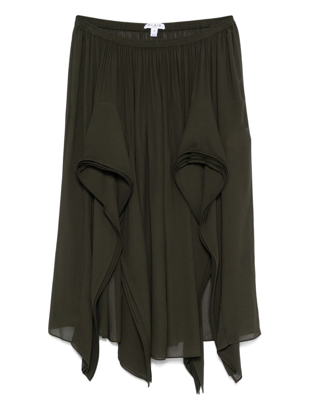 ruffled draped trousers Highlights - Olive green - Draped fabric - Asymmetrical hem - Ruffled detailing - High waist Made in France Composition Viscose 100% SIZE & FIT Model measurements Height 5 ft 10 in(1.78 m) Bust/Chest 33.85 in(86 cm) Hips 36.61 in(93 cm) Waist 26.77 in(68 cm) Washing instructions Dry Clean Only
