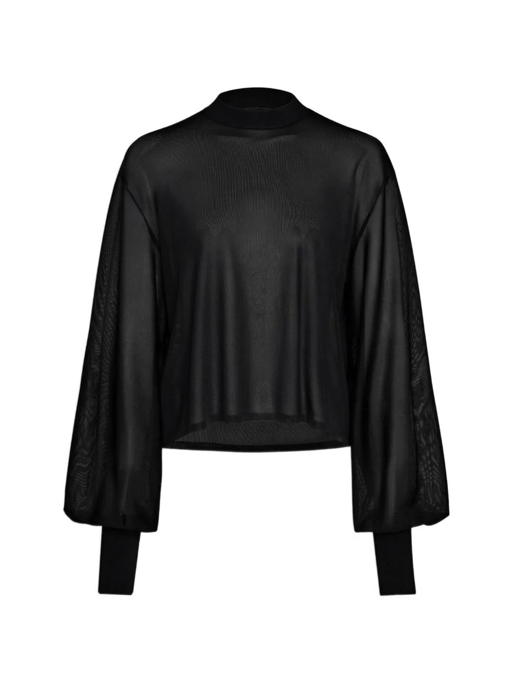 semi-sheer sweater Highlights - Black - Long sleeves - Semi-sheer - High neck - Ribbed cuffs Imported Composition Fabric 100% Washing instructions Read Manufacturer Guidelines