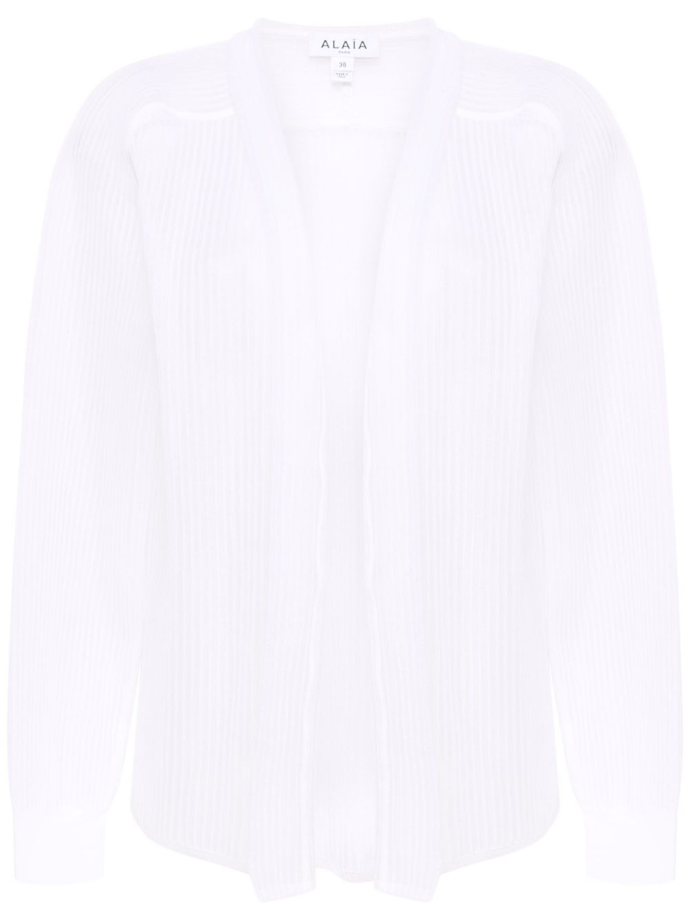 sheer stripe cardigan Highlights - White - Semi-sheer construction - Vertical stripe pattern - Raw edge - Long sleeves - Ribbed cuffs Made in Italy Composition Polyimide 61%, Silk 39% SIZE & FIT Model measurements Height 5 ft 11 in(1.8 m) Bust/Chest 31.1 in(79 cm) Hips 36.22 in(92 cm) Waist 25.98 in(66 cm) FittingInformation Designed to be unstructured, offering a loose fit throughout Made with a midweight knit, this piece offers some stretch This piece fits true to size – take your usual size Washing instructions Dry Clean Only