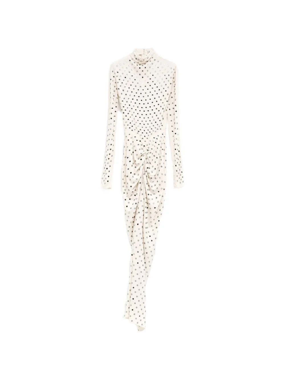 stud-embellished draped maxi dress Highlights - Off-white - Stud embellishment - High neck - Long sleeve - Rear zip fastening - Draped detailing Made in Italy Composition Body: Viscose 96%, Spandex/Elastane 4% Washing instructions Read Manufacturer Guidelines