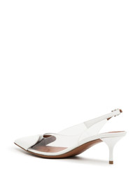 55mm slingback pumps Alaia's penchant for bold accessory silhouettes is channelled by these slingback pumps, made in Italy from smooth calf leather and elevated by a transparent upper. Highlights - Optical white - Calf leather - Pointed toe - Transparent design - Buckle-fastening slingback strap - High stiletto heel Made in Italy Composition Outer: Calf Leather 100% SIZE & FIT Measurement HEEL 2.16 in(5.5 cm)