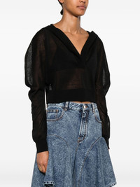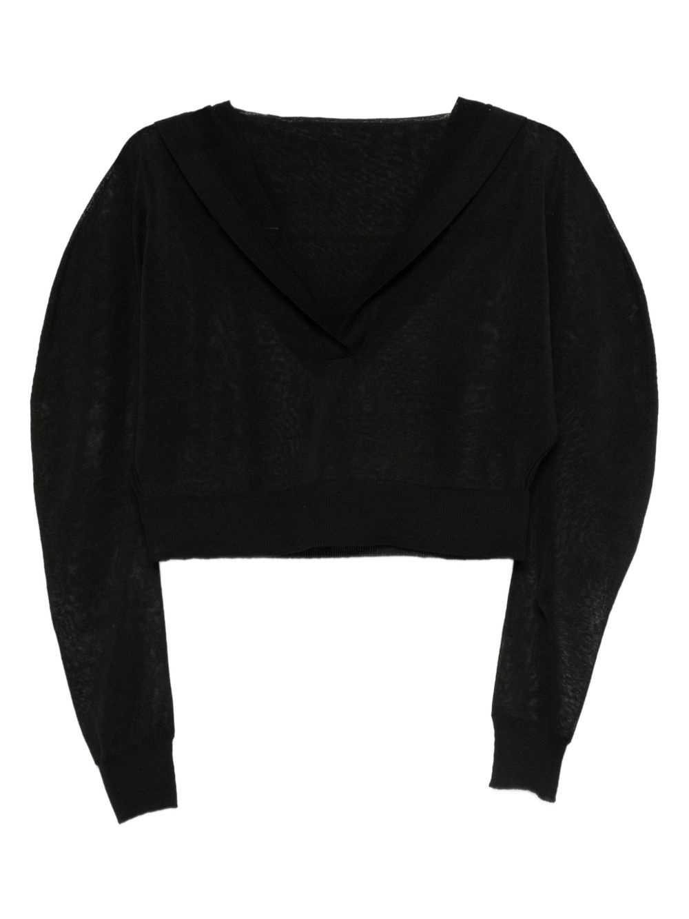 v-neck long-sleeve top Highlights - Black - V-neck - Long sleeves - Cropped - Sheer construction - Ribbed hem Made in Italy Composition Linen/Flax 90%, Silk 10% SIZE & FIT Model measurements Height 5 ft 10 in(1.77 m) Bust/Chest 33.07 in(84 cm) Hips 37 in(94 cm) Waist 24.8 in(63 cm) FittingInformation Designed for a relaxed fit, this piece allows for comfort and movement when worn Made with a midweight knit, this piece offers some stretch Washing instructions Dry Clean Only
