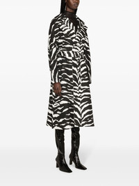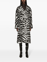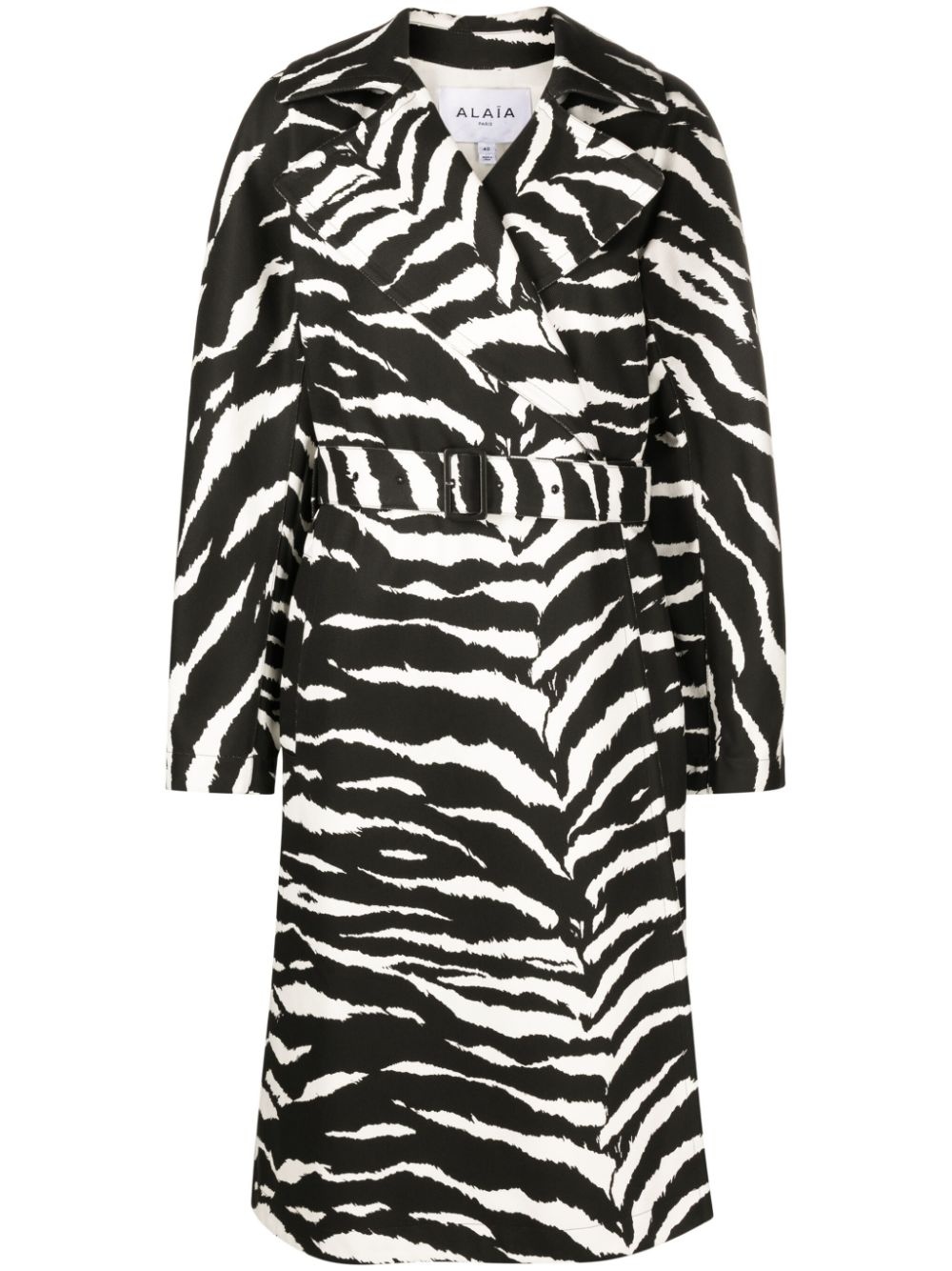 zebra-print denim trench coat Alaia puts a striking spin on classic outerwear with this black and white trench coat. Made from sturdy cotton denim, it boasts an unstructured, double-breasted silhouette saturated with a zebra print, evoking a bold, graphic look. It is complemented with a detachable waist belt, allowing custom styling. Highlights - White/black - Cotton - Denim - Zebra print - Wide notch lapels - Open front - Long sleeves - Detachable waist belt - Belt loops - Two side slit pockets - Central rear vent - Unlined - Mid-length Made in Italy Composition Lamb Skin 100%, Cotton 100% SIZE & FIT Model measurements Height 5 ft 11 in(1.8 m) Bust/Chest 34.25 in(87 cm) Hips 35.82 in(91 cm) Waist 24.8 in(63 cm) FittingInformation Designed to be unstructured, offering a loose fit throughout The belt offers adjustability for fitted preferences Made from a midweight non-stretch fabric This piece fits true to size – take your usual size