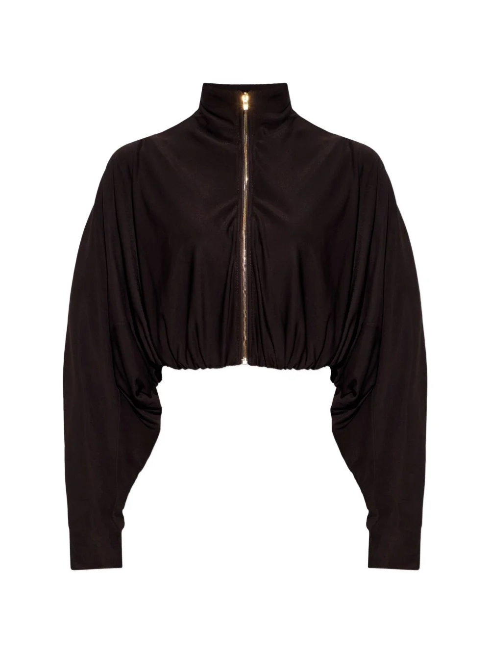 zip-up cropped jacket Highlights - Brown - High neck - Long sleeves - Zip fastening - Elasticated hem - Cropped design Made in France Composition Outer: Viscose 81% Polyamide 19% Washing instructions Read Manufacturer Guidelines