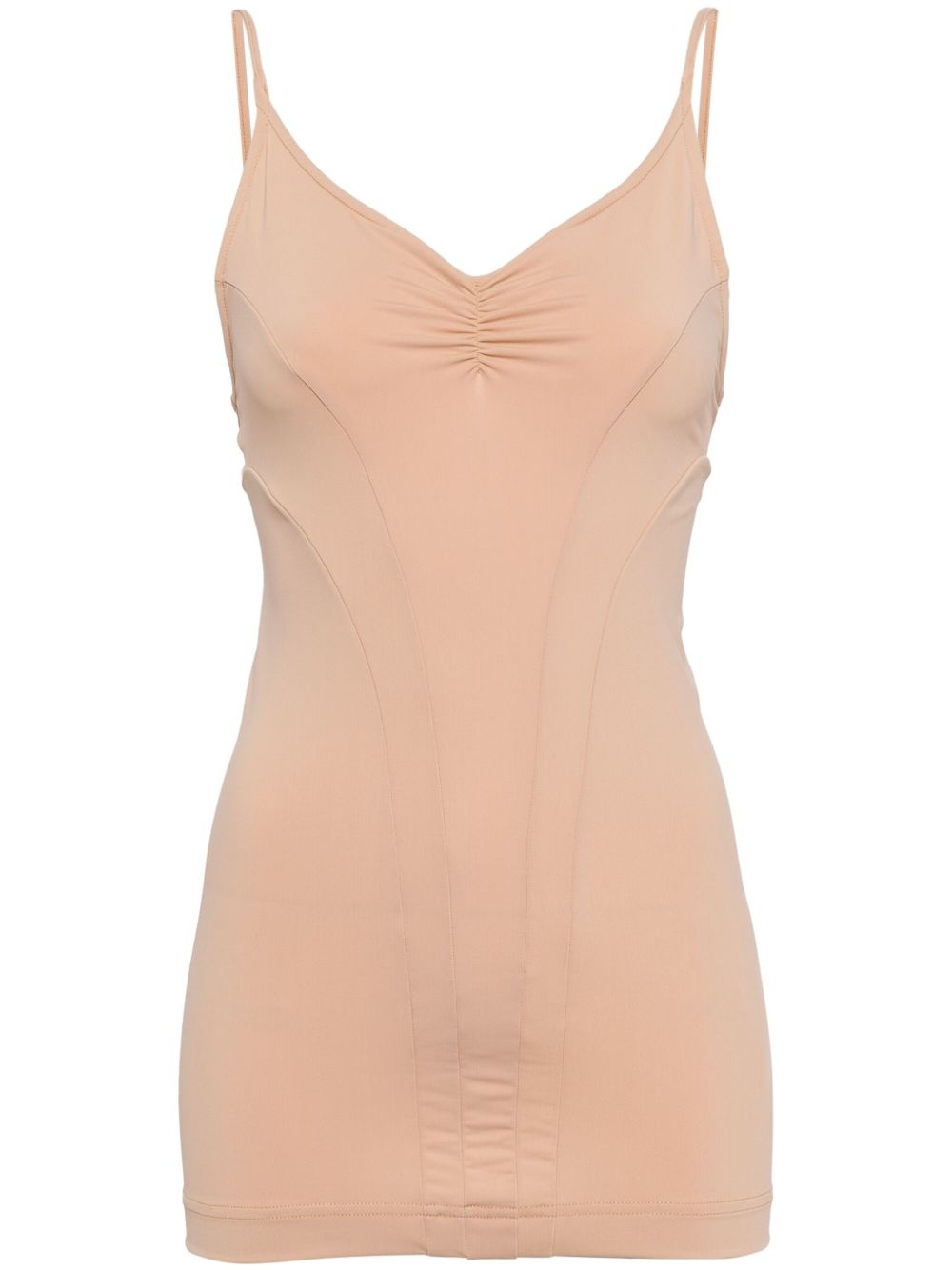 V-neck gathered top Highlights - Light brown - Stretch-design - Gathered detailing - Spaghetti straps - V-neck - Fitted waistline - Straight hem - Extra-long length Imported Composition Polyamide 80%, Elastane 20%