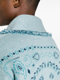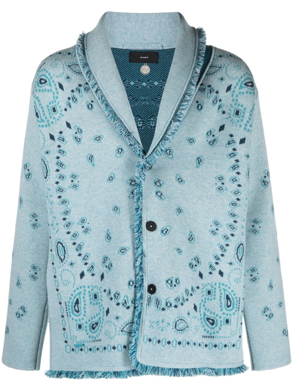 bandana-jacquard cashmere cardigan Alanui is underpinned by its bohemian style and colourful knitwear that pay tribute to its artisanal craftsmanship. A riff on the brand's signature wrap cardigan, this buttoned iteration is meticulously spun from dusk-blue cashmere yarns into a double jacquard knit and decorated with a bandana pattern throughout. Highlights - Dusk blue - Cashmere - Bandana pattern - Frayed edge - Shawl lapels - Front button fastening - Long sleeves - Straight hem Made in Italy Composition Cashmere 100% SIZE & FIT Model measurements Height 6 ft 2 in(1.89 m) Bust/Chest 39.76 in(101 cm) Hips 37.4 in(95 cm) Waist 29.92 in(76 cm) FittingInformation Designed for a relaxed fit, this piece allows for comfort and movement when worn Made with a midweight knit, this piece offers some stretch This piece fits true to size – take your usual size Washing instructions Dry Clean Only