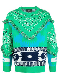 bandana-print frayed jumper forest green virgin wool knitted construction bandana print frayed detailing ribbed cuffs and hem crew neck long sleeves straight hem Made in Italy Composition Virgin Wool 100% SIZE & FIT Model measurements Height 6 ft 1 in(1.85 m) Bust/Chest 35.82 in(91 cm) Hips 37.79 in(96 cm) Waist 29.13 in(74 cm) Measurement CHEST 44.09 in(112 cm) SLEEVE LENGTH 21.65 in(55 cm) LENGTH 25.98 in(66 cm) Washing instructions Dry Clean Only