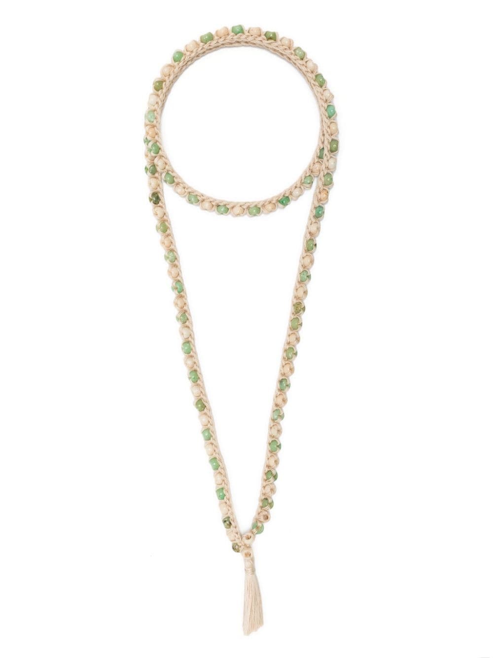 beaded crochet necklace Highlights - Light beige/jade green - Cotton - Crochet - Bead embellishment - Tassel detail - Braid detailing - Long length Made in Italy SIZE & FIT Model measurements Height 5 ft 11 in(1.8 m) Bust/Chest 31.49 in(80 cm) Hips 36.61 in(93 cm) Waist 24.4 in(62 cm) Measurement Length when open 51.18 in(130 cm) PENDANT LENGTH 2.28 in(5.8 cm) PENDANT WIDTH 0.66 in(1.7 cm) WIDTH 0.31 in(0.8 cm)