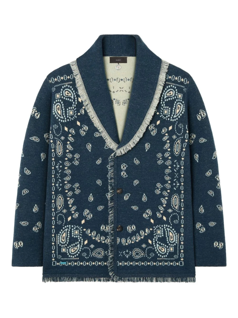 cashmere cardigan Highlights - Blue - Jacquard knit - Shawl lapels - Front button fastening - Fringed trim - Bandana pattern Made in Italy Composition Cashmere 100% Washing instructions Read Manufacturer Guidelines