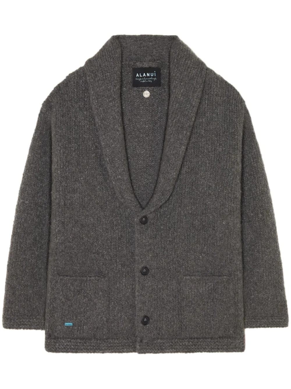 Finest ribbed cardigan Knitted in Italy from sumptuous cashmere fibres, this medium-grey Alanui cardigan showcases a restrained side of the brand, boasting a minimalist, unadorned design defined by its signature shawl collar. Highlights - Grey - Cashmere-silk blend - Ribbed knit - V-neck - Mini logo tag - Front button fastening - Two front patch pockets Made in Italy Composition Cashmere 90%, Silk 10%