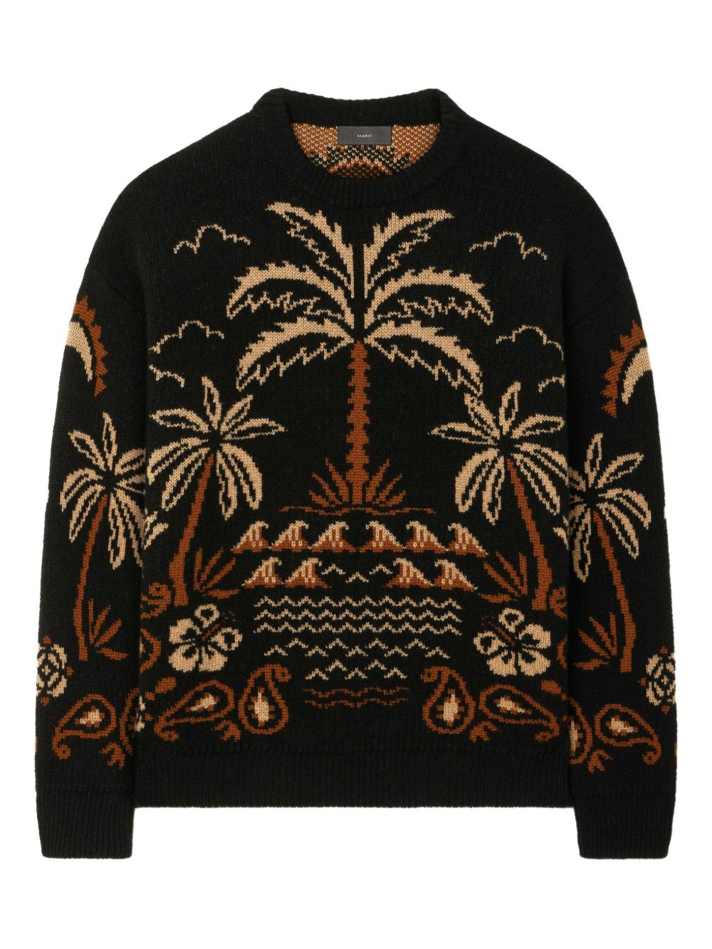Glimpse of Eden palm-tree intarsia sweater Highlights - Black - Palm-tree intarsia - Paisley pattern - Wave pattern - Floral pattern - Crew neck Made in Italy Composition Wool 79%, Cashmere 13%, Cotton 8% Washing instructions Read Manufacturer Guidelines