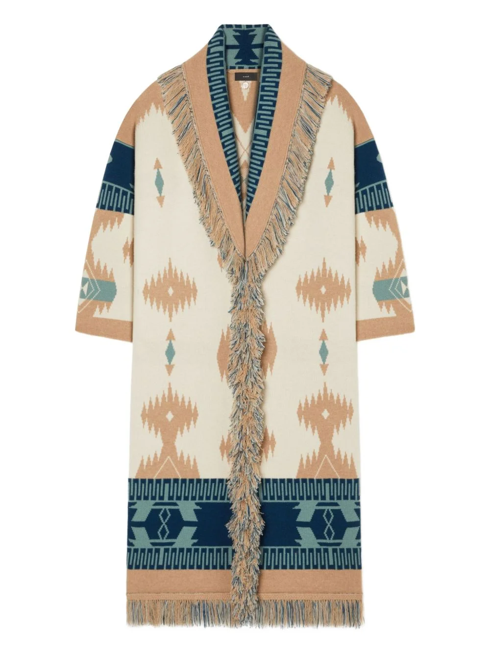 Icon jacquard fringed cardi-coat Highlights - Light beige - Jacquard knit - Fringed trim - Shawl lapels - Self-tie belt - Long sleeves Made in Italy Composition Virgin Wool 100% Washing instructions Read Manufacturer Guidelines