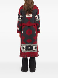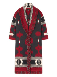 Icon jacquard fringed coat Highlights - Dark red - Jacquard pattern - Fringed trim - Belted waist - Shawl collar - Wool Made in Italy Composition Virgin Wool 100% Washing instructions Read Manufacturer Guidelines