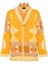 Icon pattern-jacquard cardigan Highlights - Mustard yellow/multicolour - Cashmere - Patterned intarsia knit - Fringe detailing - Shawl lapels - V-neck - Front button fastening - Drop shoulder - Long sleeves - Two front patch pockets - Straight hem Made in Italy Composition Cashmere 100% SIZE & FIT Model measurements Height 6 ft 2 in(1.87 m) Bust/Chest 36.22 in(92 cm) Hips 37 in(94 cm) Waist 27.95 in(71 cm) FittingInformation Designed to be unstructured, offering a loose fit throughout Made from a midweight non-stretch fabric, this piece offers minimal elasticity when worn This piece fits true to size – take your usual size Washing instructions Dry Clean Only