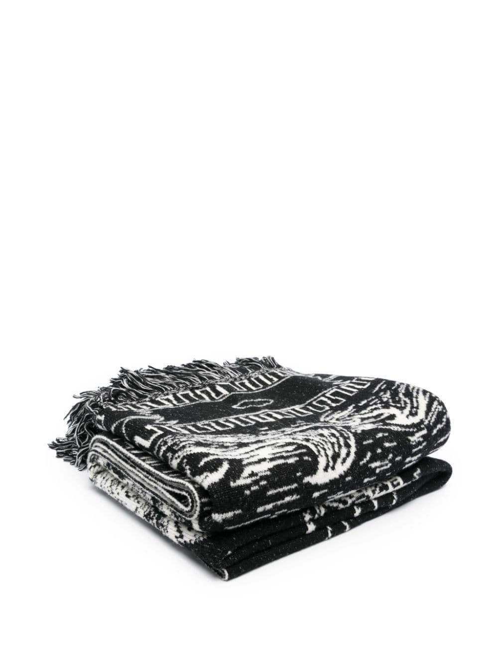 intarsia-knit frayed scarf Highlights - Black/white - Virgin wool blend - Knitted construction - Patterned intarsia knit - Frayed edge - Wrap design Made in Italy Composition Virgin Wool 84%, Polyamide 16% SIZE & FIT Measurement LENGTH 74.8 in(190 cm) WIDTH 51.18 in(130 cm) Washing instructions Dry Clean Only